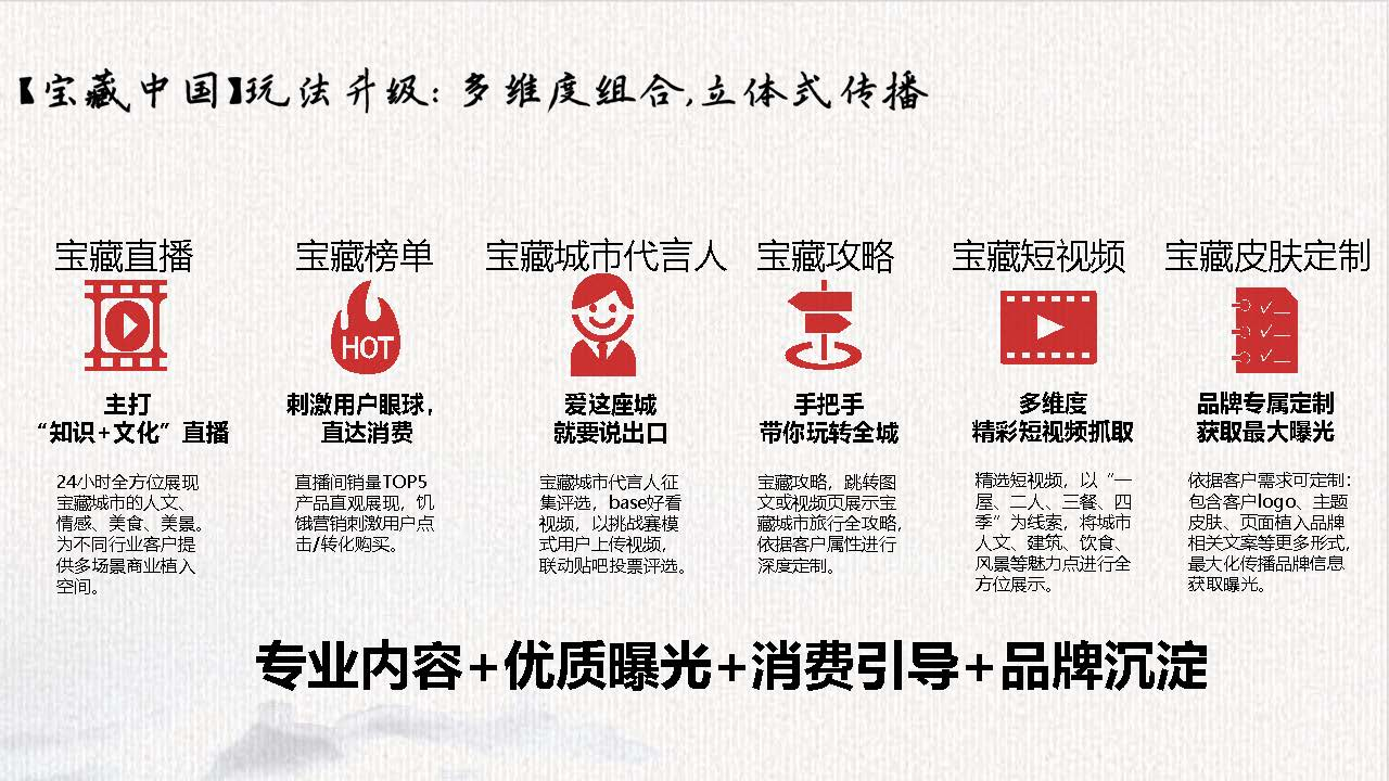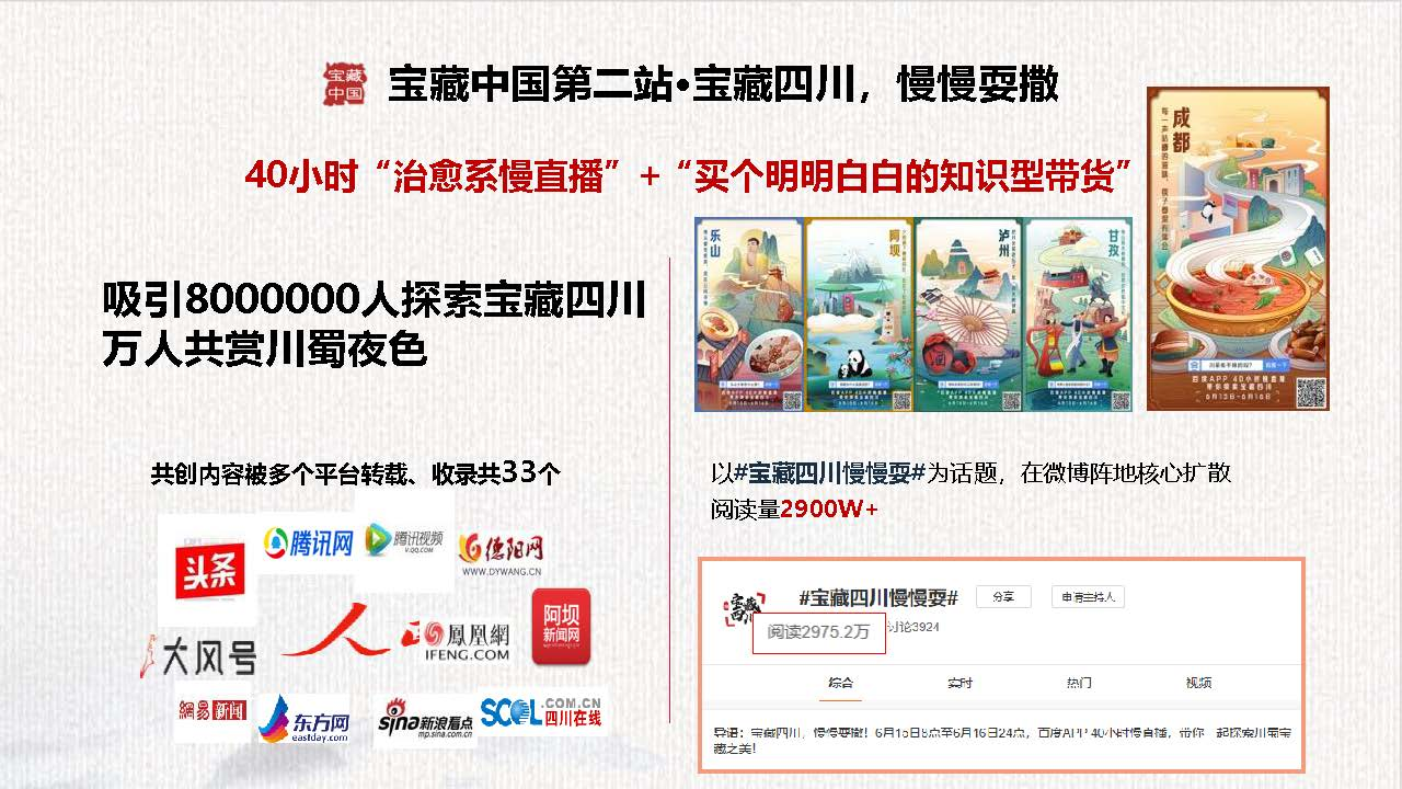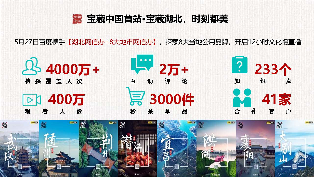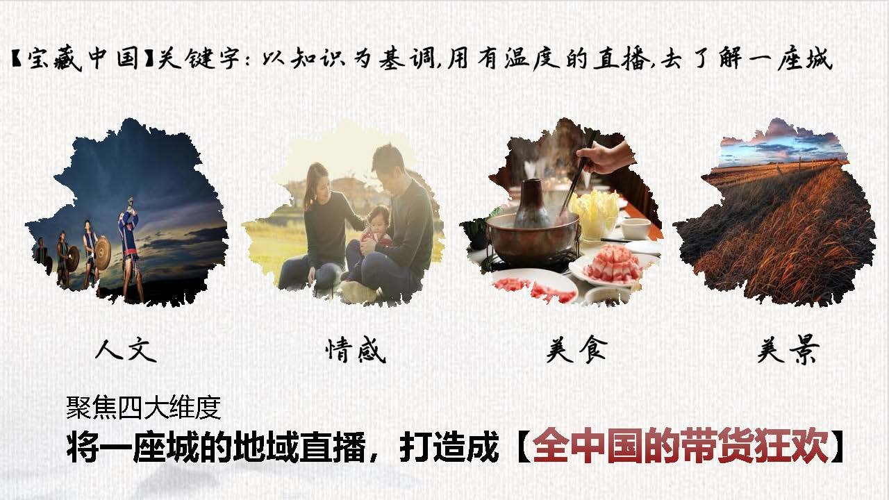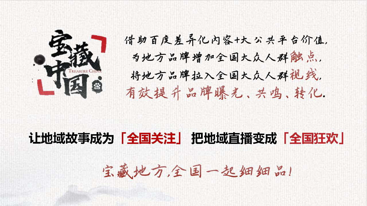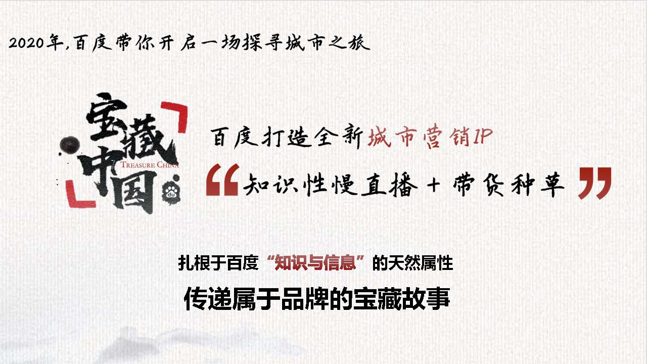 ? 2020年,百度帶你開啟一場探尋城市之旅百度打造全新城市營銷IP《寶藏中國》——知識性慢直播+帶貨種草扎根于百度“知識與信息”的天然屬性,傳遞屬于品牌的寶藏故事 ? ? ? ? ? ? ? ? ? ? ? ? ? ?